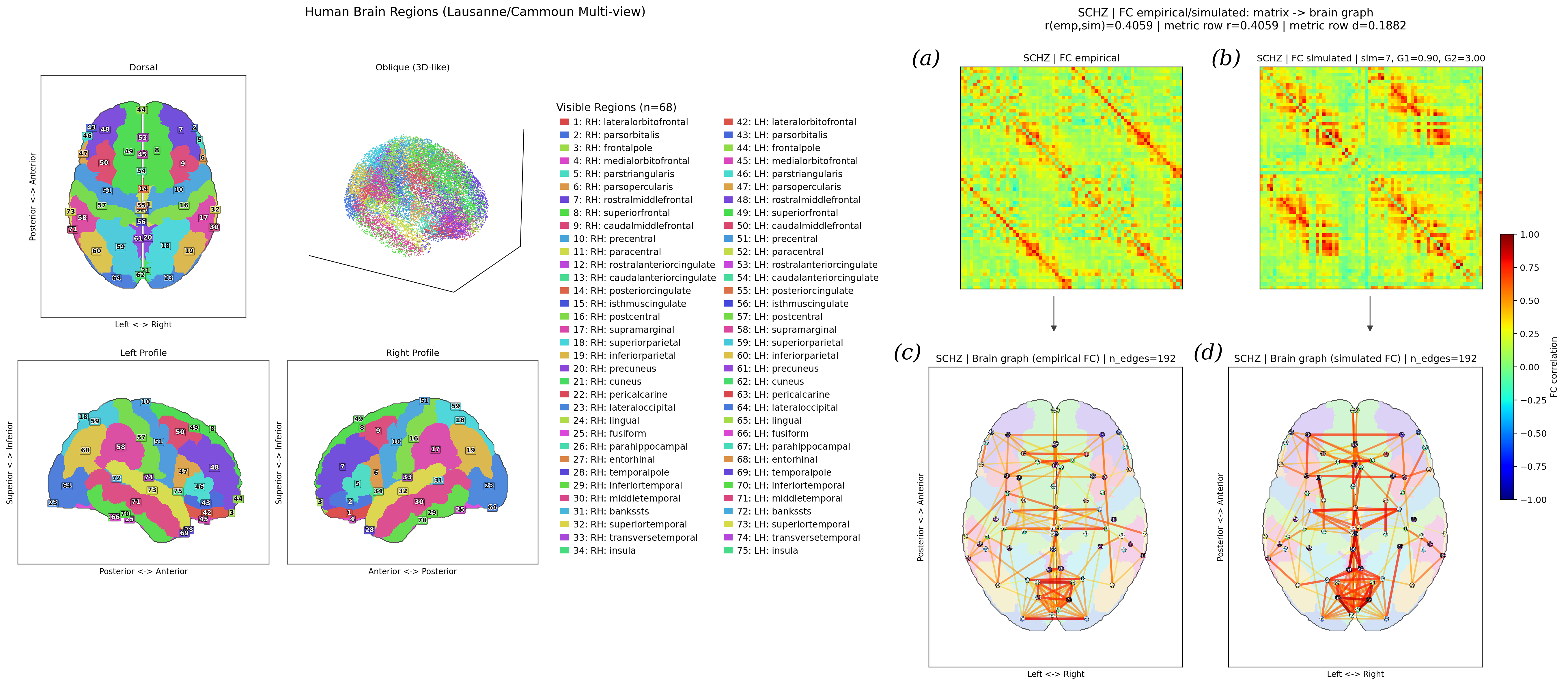 - Figure 1. Hemispheric dynamic mean field (DMF) framework, used here as a continuation of the Wilson-Cowan line [Plüss et al. (2026)]. The brain rendering is based on the Lausanne parcellation [Cammoun et al. (2012)], restricted in this case to 68 cortical regions. The matrices and the functional activity patterns displayed on the brain renderings correspond to the schizophrenia group (SCHZ).
