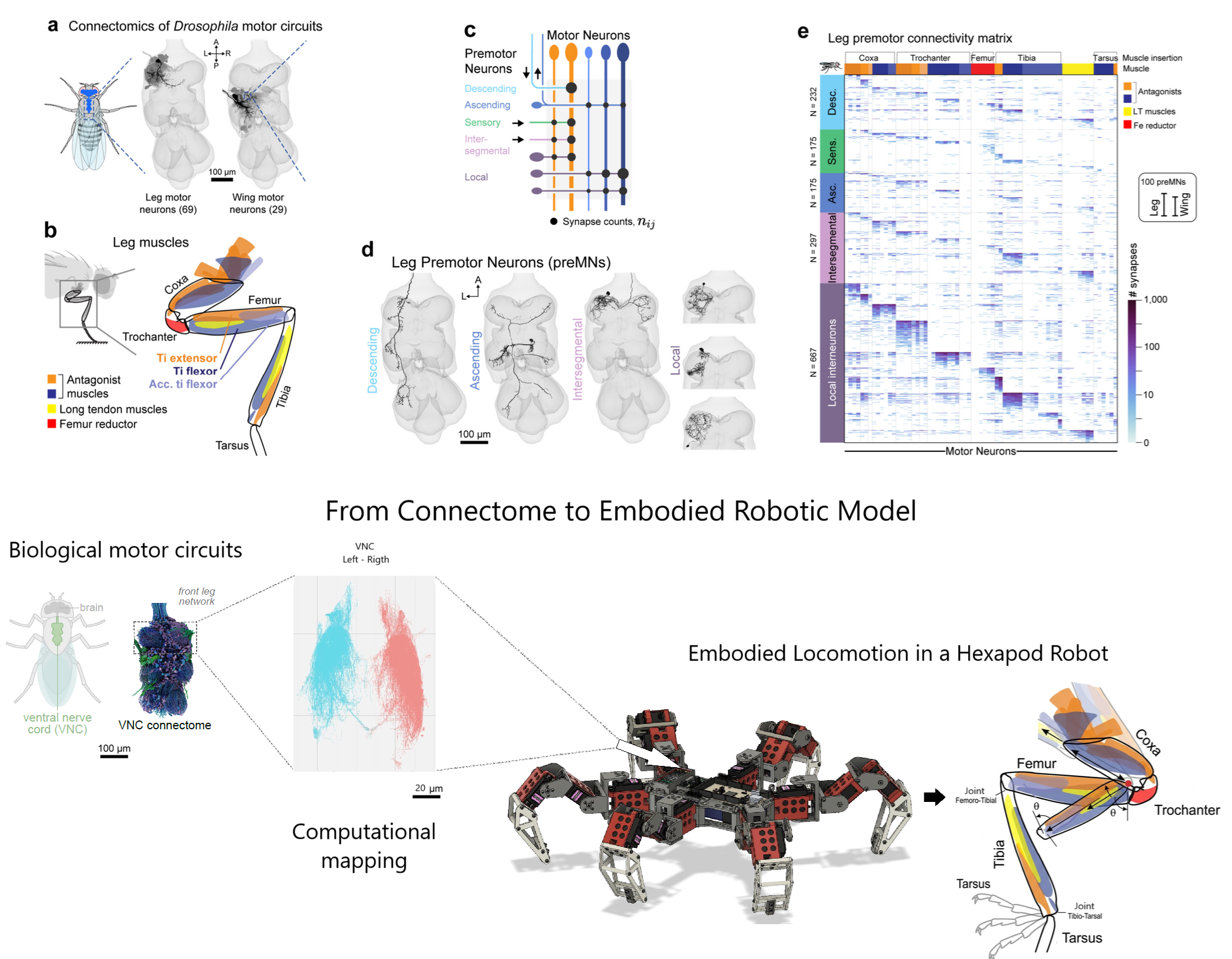 - From Drosophila leg motor circuit organization to computational mapping and embodied hexapod robotics. Biological circuit panels [Lesser et al. (2025)]. Robotic platform based on the open CAD and code [Markwtech (2019)].